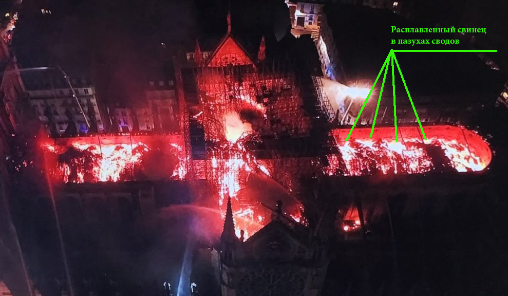 Все рассказанное выше было не для красного словца и не в качестве необязательного исторического экскурса — без понимания того, что из себя представляет готический собор в конструктивном отношении, невозможно понять, что произошло во время пожара. Поскольку пожар начался после окончания рабочего дня, можно почти со 100%-й уверенностью предполагать, что его причиной явилось замыкание во временной проводке, проведенной в связи с реставрационными работами. Стальные леса, само собой, не загорелись, а вот столетиями высушенные стропила занялись как порох. В огромном подкровельном пространстве огонь распространился почти мгновенно, расплавляя листы свинцового покрытия. Свинец вообще-то плавится уже при температуре + 357,5⁰С, но температура в пожаре такого масштаба всегда выше (обычно порядка +1000⁰С). Судя по тому, что возле эпицентра пожара — около деревянного шпиля — стальные леса «поплыли», в этом месте температура доходила до +1200⁰С, но в других местах она была ниже. Стропила при такой температуре сгорают очень быстро, а расплавленный свинец проливается на своды, стремительно нагревая камень до очень высоких температур. При этом свинец стекает по сводам в их пазухи — помните, что это такое? — я уже рассказывал выше — и образует там раскаленные «озерца». (Рис. 3.) При этом, помимо прокала камня, нагревается и выгорает известковый раствор забутовки.