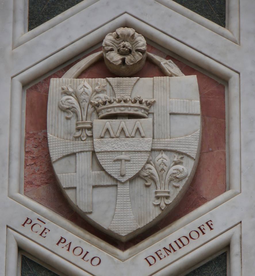 В Европе любят гербы. Их рисуют на стенах, высекают на пьедесталах, лепят на карнизы, выкладывают мозаикой на полу. Общественные здания обычно украшены целыми рядами гербов. Нередко их подписывают, ну, чтоб знали. Вот на флорентийском il Duomo под одним из гербов я наткнулся на знакомую фамилию – PCE PAOLO DEMIDOFF. Pce – это сокращение от principe, князь. Paolo, значит Павел. Демидофф – само собой понятно. Непонятно было, однако, почему князь? Ведь Демидовы графский род, и почему вдруг во Флоренции?