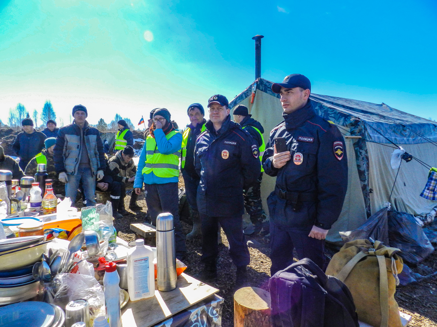 «В воскресенье там будет огромная толпа народа — больше ста человек. Это общий сбор. В десять утра они выдвинутся разговаривать с охранниками. Это я только тебе говорю, мы пока шифруемся», — пообещал мне один из активистов еще в Сыктывкаре. В десять утра уже тепло, ярко светит солнце и поют птицы, но никаким общим сбором и не пахнет. И я разочарована. С экологом Ниной Ананиной из Сыктывкара отправляемся к «Ленинграду», попить чай, и обнаруживаем майора полиции с двумя сотрудниками. Они переписывают данные активистов, потому что от рабочих поступила жалоба — кто-то накануне вечером якобы бросил в погрузчик деревянный брусок с забитыми в него гвоздями.