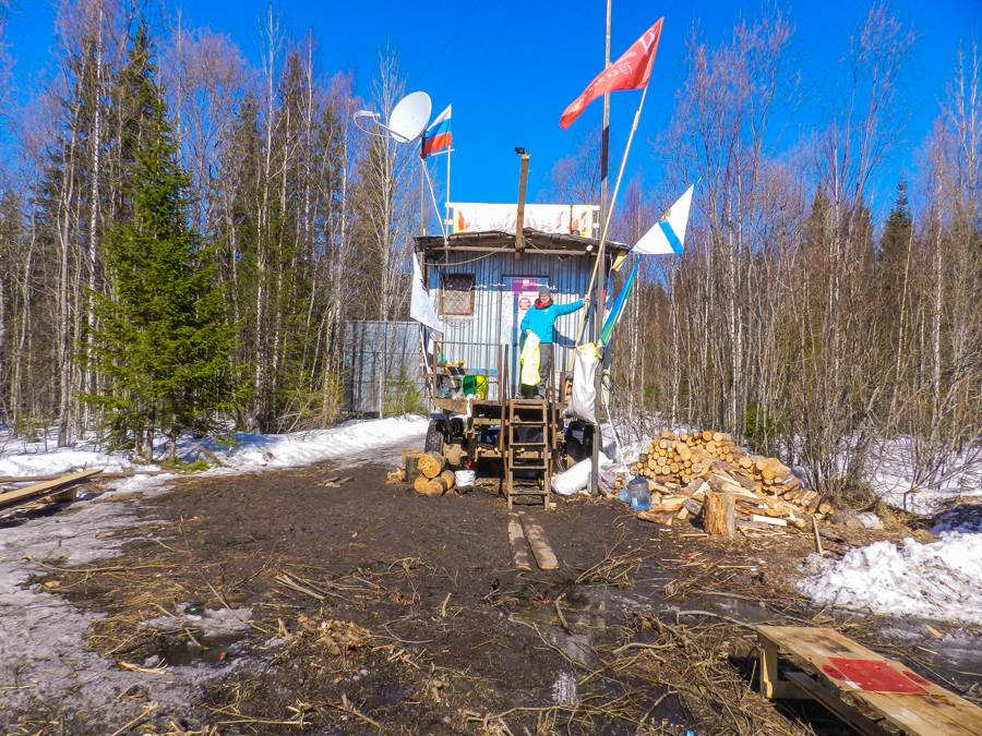 Сразу выясняется, что один из сыктывкарцев, Юра, не взял резиновые сапоги. Вокруг лужи и грязь. Снег постепенно тает. Рабочим на Шиесе приходится откачивать воду из вырытых ими канав, но большая часть работы у них еще впереди. Станция расположена в заболоченной местности, и во времена существования поселка здесь даже не хоронили — кругом топь. Но пока земля смерзшаяся и интенсивное таяние снега не началось, у рабочих на полигоне не так много забот. Часть плит, в том числе и тех, на которых установлено общежитие, здесь уложили зимой, и как они поведут себя в мае, неизвестно. Слева от станции виднеется армейская палатка «Сталинград», чуть дальше — «Ленинград», палатка побольше. В обеих топятся печки-буржуйки. Из-за разливающейся воды кажется, что «Ленинград» находится на острове. Рядом с палаткой костер и накрытый стол. Приехавших сразу поят чаем, а они в свою очередь выкладывают из рюкзаков продукты, сигареты и теплые вещи, которые привезли волонтерам. После чая отправляемся на экскурсию.