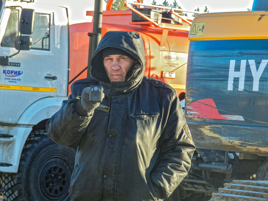 — Хоть бы природа нам помогла, хоть бы они тут все потонули, — с надеждой говорит волонтер Наталья Луговская, приехавшая в Шиес из Котласа вместе с мужем Михаилом. Дома у них осталось четверо детей, ради которых они и решили бороться со свалкой. Наталья надеется на резкое потепление, при котором уровень воды в местных болотах серьезно поднимается. Мы выходим на большую площадку, выложенную бетонными плитами, и нас тут же окружают охранники в черной униформе. Лица у большинства из них закрыты. Они игнорируют просьбы представиться и показать документы. Здоровый детина со сломанным носом на все вопросы только кивает или крутит головой, не забывая снимать меня на камеру. Когда я отделяюсь от группы, за мной следует несколько человек. Пока мы ходим между техникой, рассказываю, что здесь планируется строительство огромного мусорного полигона, угрожающего жизни и здоровью людей.