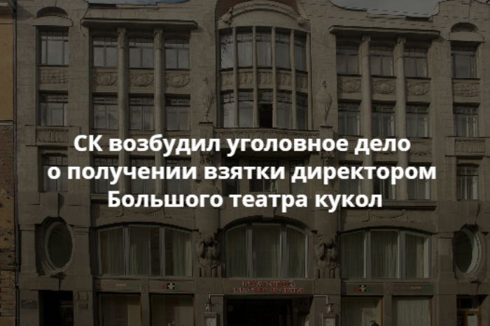 Следственный комитет возбудил уголовное дело о получении взятки в особо крупном размере (ч.6 ст. 290 УК РФ) в отношении директора Большого театра кукол (БТК) в Петербурге. Об этом сообщило само ведомство.