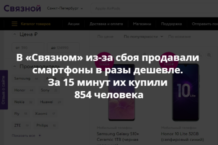 В интернет-магазине «Связного» из-за сбоя в программном обеспечении, который длился 15 минут, смартфоны продавались по ценам в несколько раз ниже рыночных. За это время покупки совершили 854 человека. Об этом пишет TJ со ссылкой на объединенную пресс-службу «Связного» и «Евросети».