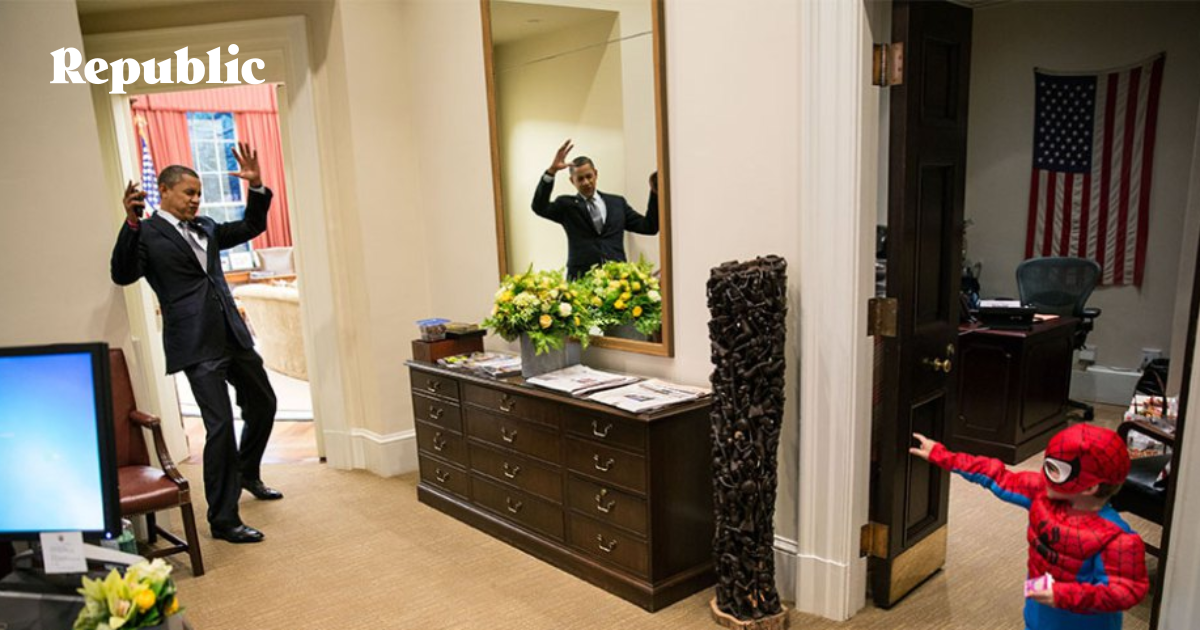 Сын одного из секретарей Белого дома нарядился Человеком-пауком и «поймал» президента. Вашингтон, США, 2012 год