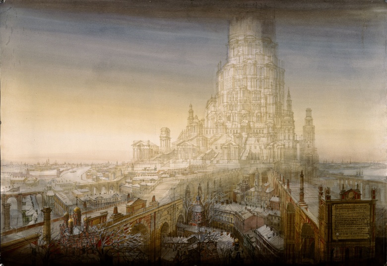 "Московская башня" (Михаил Филиппов, 1990). Образ Вавилонской башни — красивой архитектурной мечты, которая никогда не будет построена в реальности, — может служить символом "бумажной" архитектуры.