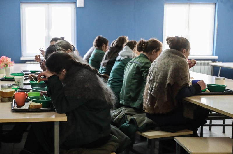 Заключенные в столовой Можайской женской исправительной колонии № 5Фото: Сергей Савостьянов/ТАСС Мы собираем оставшуюся еду и везем ее по маршруту дальше — в палатку обогрева, которая находится недалеко от центра. По задумке, палатка должна не дать умереть от холода тем, кто не попал в социальный приют. Она работает с декабря по начало марта, но реальная зима здесь гораздо длиннее календарной. Устанавливать ее на более длительный срок не получается — нет денег.