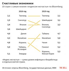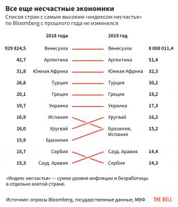 Как формируется рейтинг. При составлении рейтинга аналитики Bloomberg суммируют два показателя — прогнозируемый экономистами уровень инфляции и безработицы в 62 странах (при оценке результатов 2018 года «индекс несчастья» подсчитывался с опорой на фактические данные, 2019-го — на прогнозные).