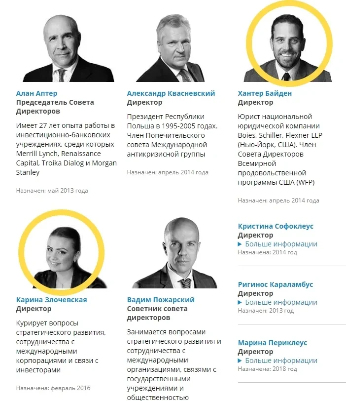 Байден-младший был назначен членом совета директоров крупнейшей на Украине частной газовой компании Burisma Holdings. Это назначение не прошло мимо американской печати, которая многозначительно отметила, что отцу Хантера Байдена было перед этим поручено курировать американо-украинские отношения и, в частности, экономическую помощь Украине.