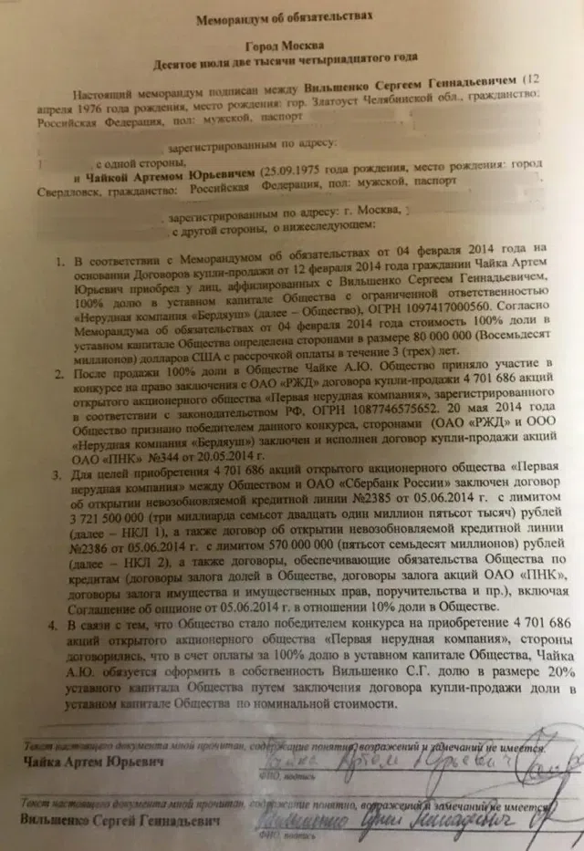 В основе дела — результаты аудита, который в «Бердяуше» провели после покупки компании Артемом Чайкой. Чайка-младший приобрел ООО «Нерудная компания «Бердяуш» у Вильшенко. В феврале 2014 года бизнесмены подписали «Меморандум», в котором зафиксировали, что Чайка-младший приобретает у Вильшенко его долю за 80 миллионов долларов.