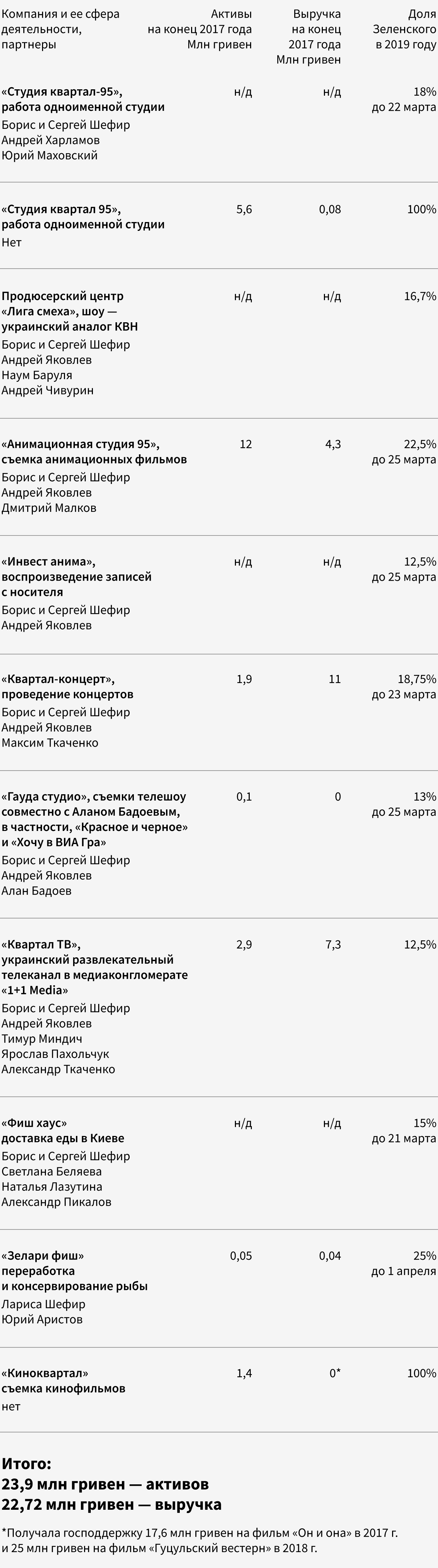 Весной 2019 года Зеленский начал передавать свои доли в компаниях коллегам по команде из «Квартал 95». В этом бизнесе у него три ключевых партнера: сценарист, продюсер и режиссер Андрей Яковлев, известный по сериалам «Сваты» и «Солдаты», и продюсеры студии братья Борис и Сергей Шефиры.