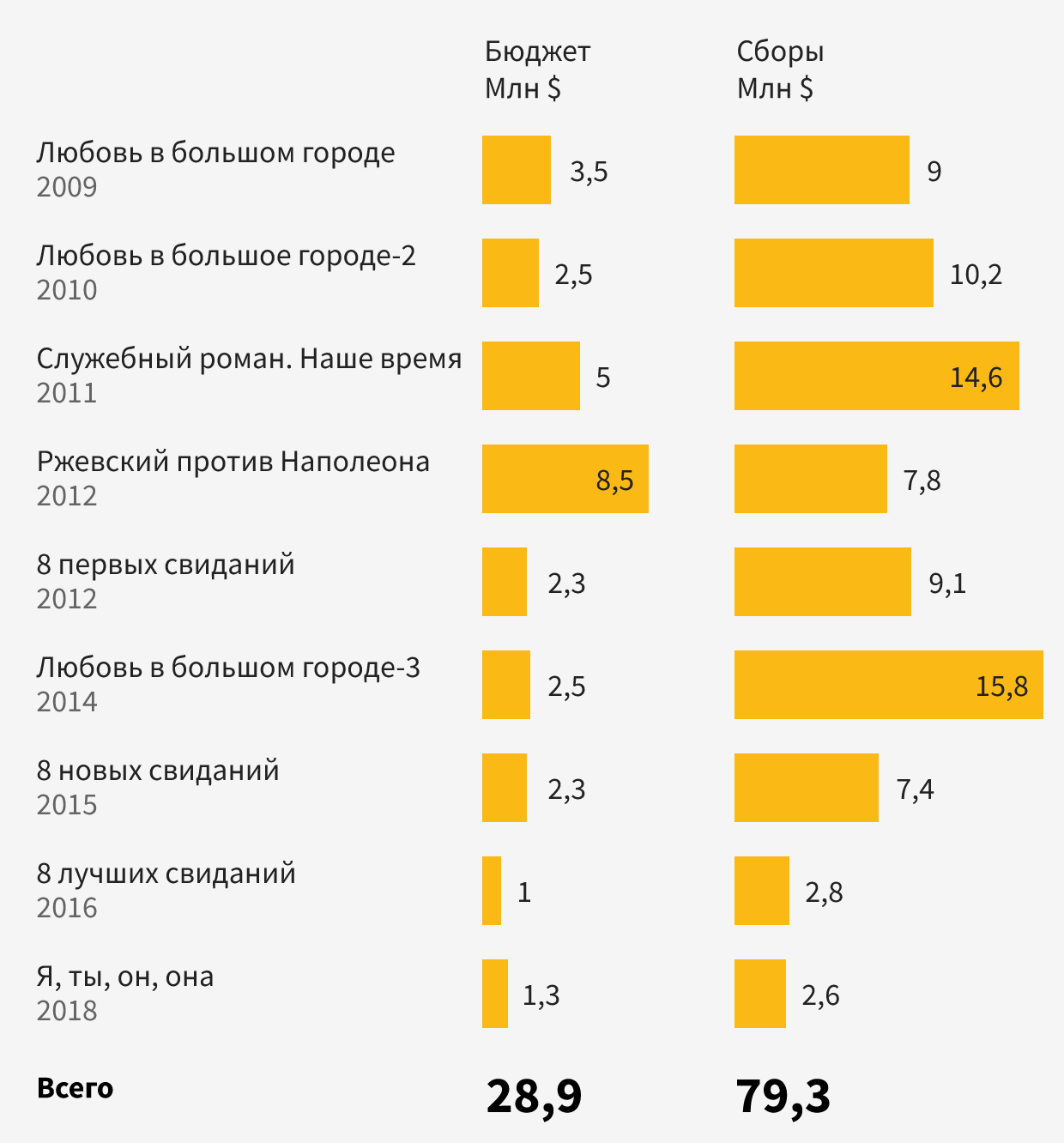 И большая часть из них были очень успешными: суммарные сборы от показов фильмов студии в кинотеатрах превысили $80 млн, или 5,1 млрд рублей, при втрое меньшем бюджете.
