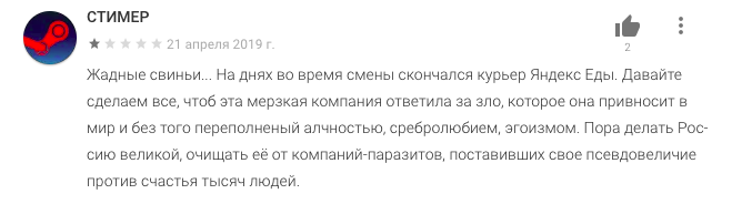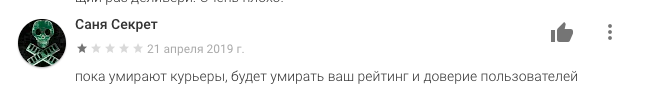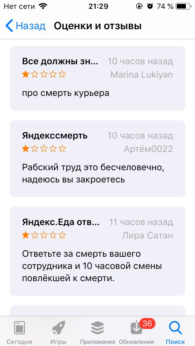 Автор треда, рассказавший о смерти курьера, также предложил понизить рейтинг приложения «Яндекс.Еда» в AppStore и GooglePlay и оставлять негативные отзывы. Многие пользователи после этого действительно стали занижать оценку приложения, обвиняя сервис в смерти курьера и плохих условиях труда.