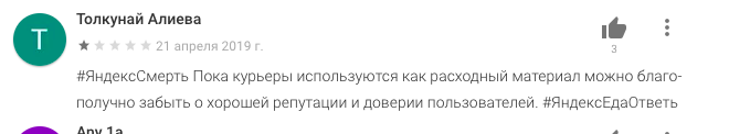 В четверг, 18 апреля, стало известно о смерти курьера «Яндекс.Еды» после 10-часовой смены. 21-летний Артык Орозалиев умер на улице. В соцсетях указывали на то, что к смерти Артыка привела переработка, и обсуждали условия труда в сервисах доставки еды. Позднее пользователи запустили флешмоб #яндекссмерть и стали занижать оценки приложению «Яндекса».
