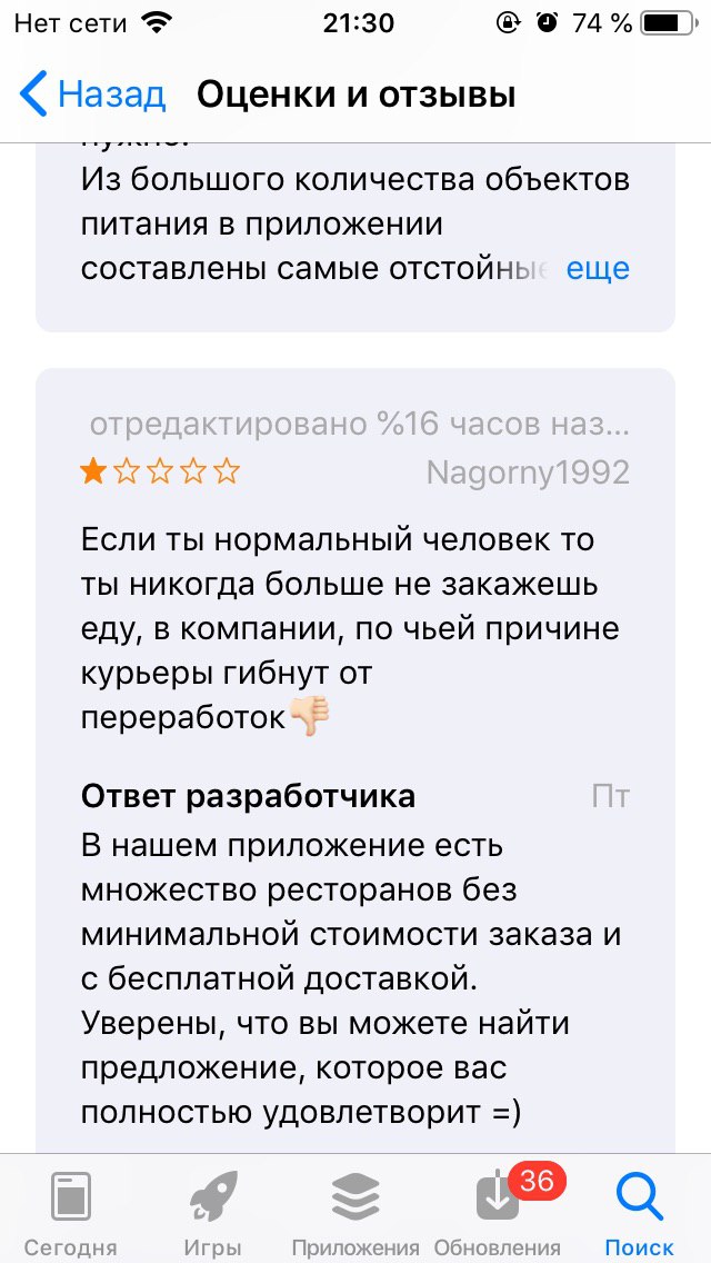 В AppStore и GooglePlay оставляют негативные пользователи о сервисе из-за случая с курьером