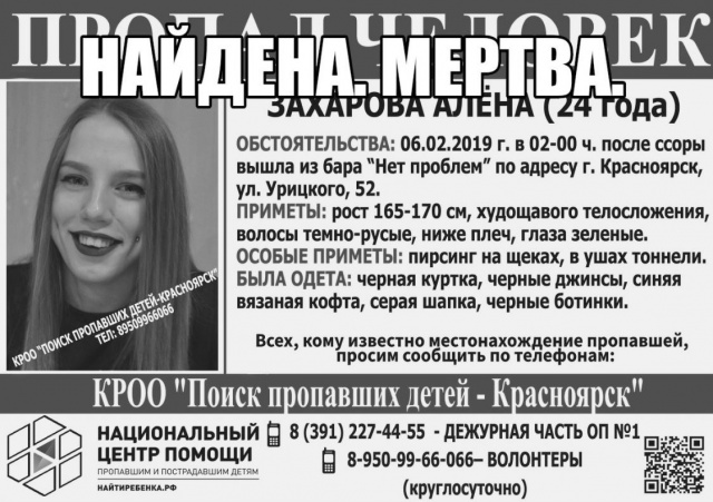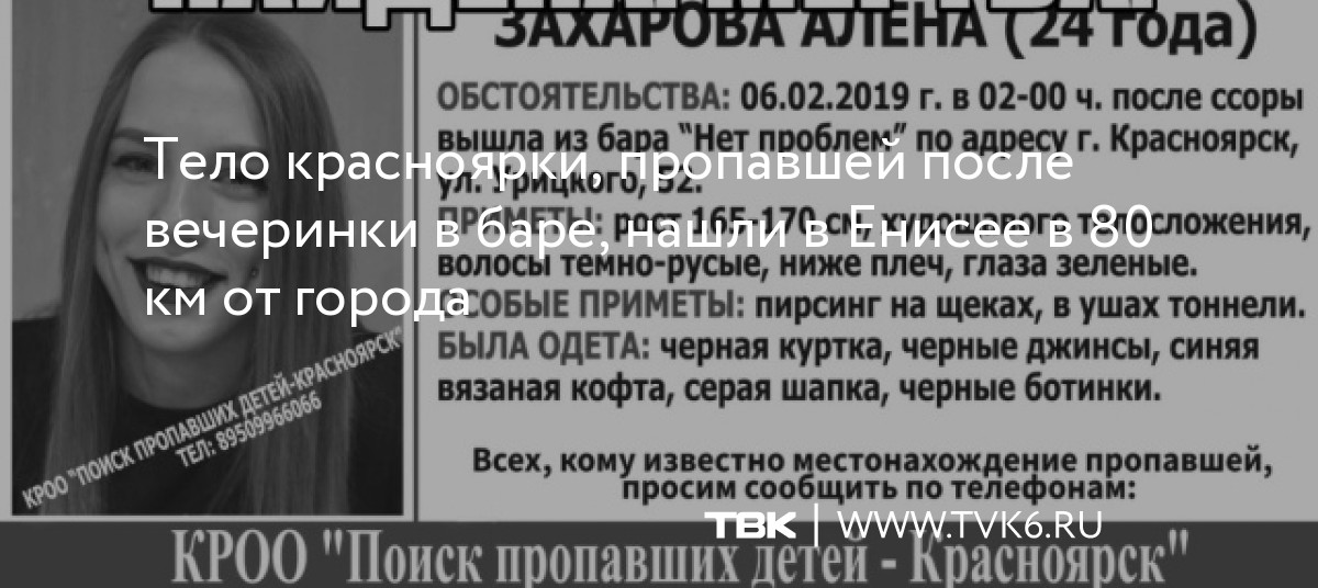 «По предварительной версии, в феврале 2019 г. 24-летняя девушка отдыхала вечером в одном из баров Красноярска с друзьями. Между молодыми людьми произошел конфликт, после которого девушка покинула заведение и ушла одна в неизвестном направлении.Вчера ее тело обнаружили в прибрежной зоне реке Енисей на территории Сухобузимском района», – говорится в сообщении ведомства.