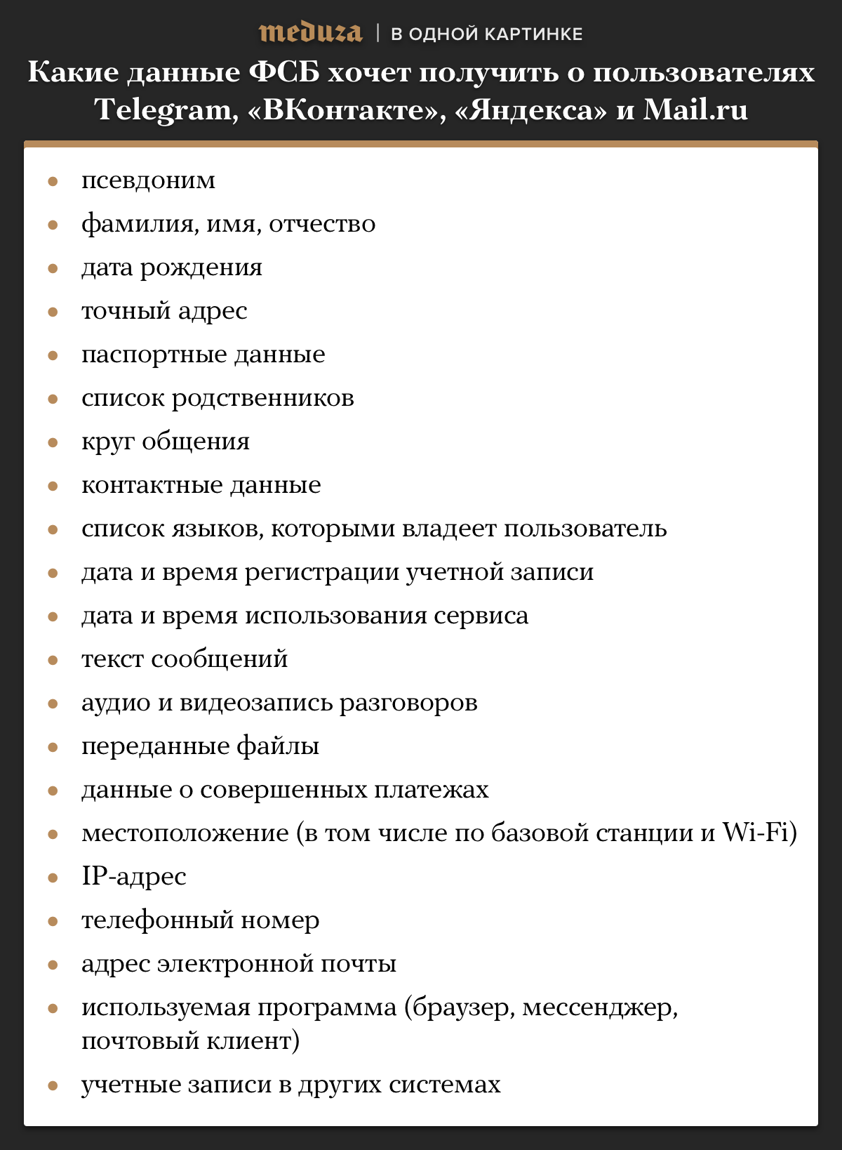 Операторы связи и организаторы распространения информации должны до шести месяцев хранить все данные и метаданные пользователей для спецслужб. Это весь интернет-трафик, любые сообщения и сведения о том, когда и кем они были переданы и получены. Если информация зашифрована, то ключи надо передать ФСБ.