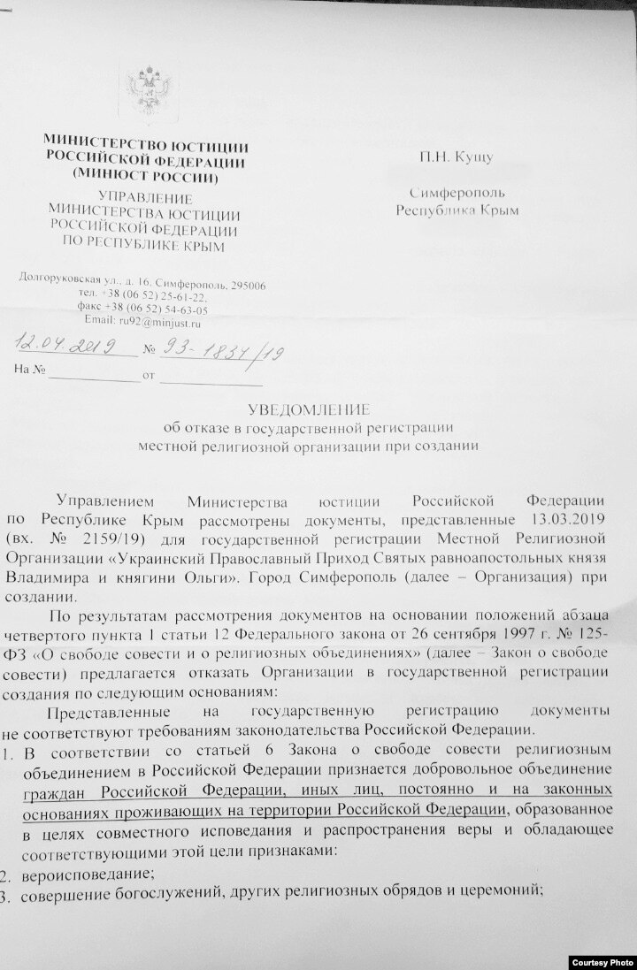 В Управлении министерства юстиции России по Крыму предложили исправить устав для регистрации украинского православного прихода на полуострове. Об этом 23 апреля Крым.Реалии рассказал архиепископ Крымской епархии Православной церкви Украины Климент.