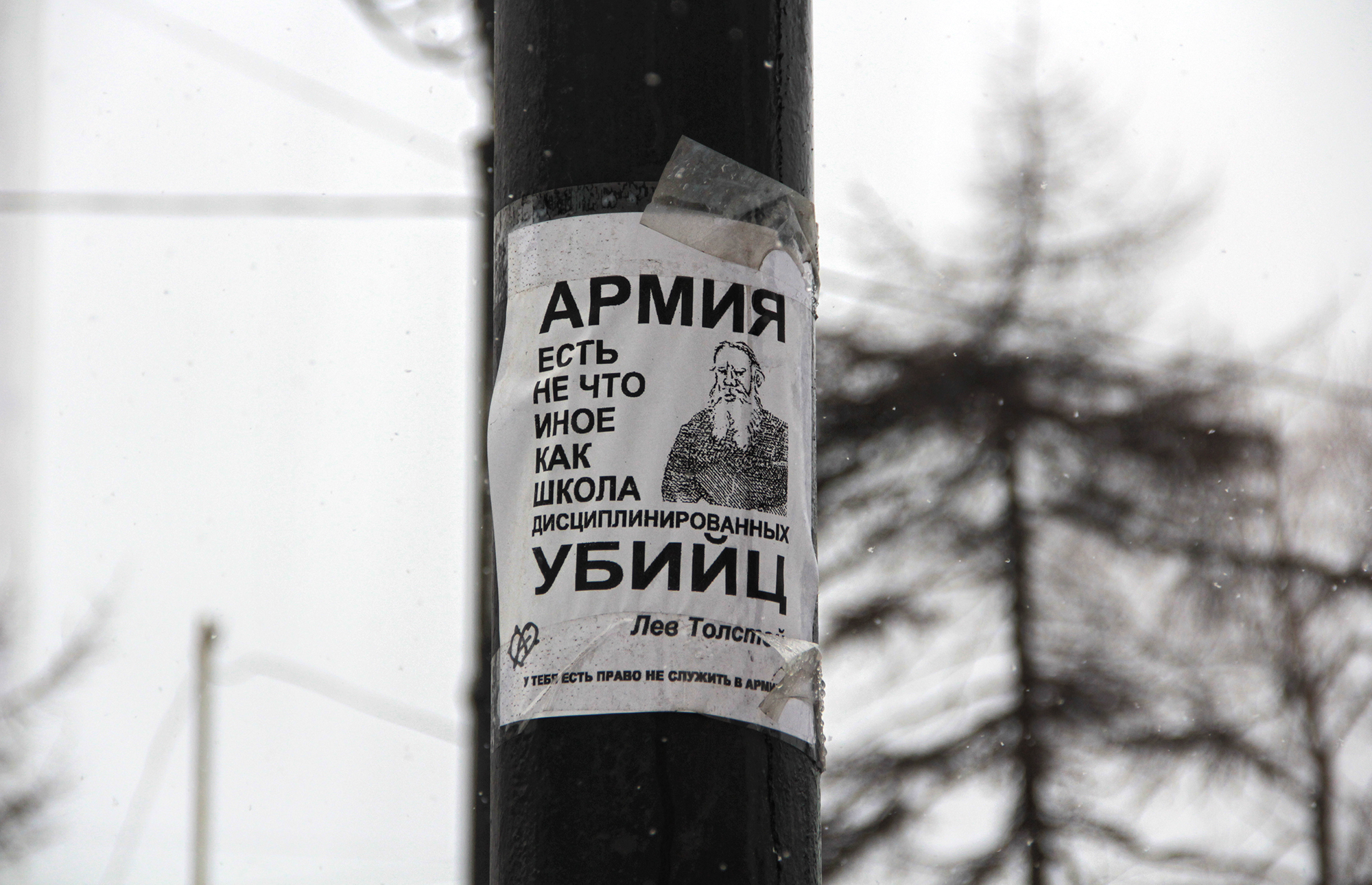Часть листовок уже успели снять, но не очень аккуратно, оставив призыв не служить в армии.
