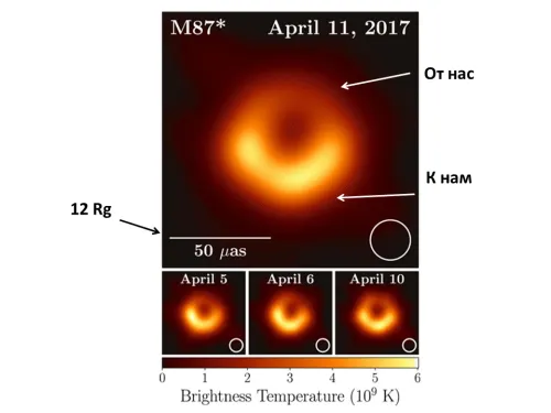 Заметны небольшие изменения в распределении яркости вдоль по светлому кольцу. Это естественно: постоянная времени изменений на радиусе фотонного кольца (около световых суток) — дни. Мы видим, как дышат некие неоднородности в аккреционном диске. Бросается в глаза разная яркость верхней и нижней части кольца. Это объясняется тем, что мы наблюдаем аккреционный диск не точно плашмя, а под небольшим наклоном. Диск перпендикулярен джету. В координатах картинки джет направлен вправо. Диск вращается по часовой стрелке, поэтому нижняя часть кольца приближается к нам, а верхняя удаляется. Этого достаточно, чтобы релятивистская аберрация давала заметную разницу в яркости.