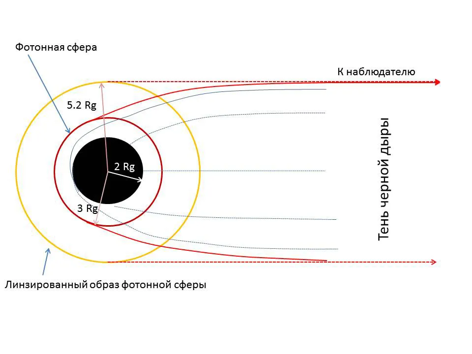 Радиус тени черной дыры: Ra = 5,2 Rg. Тень — не что иное, как линзированная фотонная сфера (см. рис. 2). Угловой размер — 20 микросекунд.