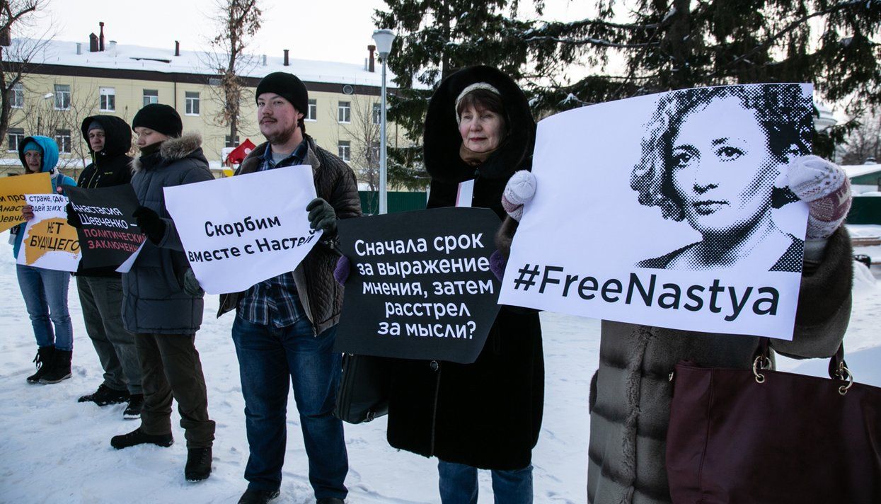 Dmitry Tkachuk / URA.RU / TASS Supporters of Open Russia activist Anastasia Shevchenko picket in Tyumen. February 10, 2019