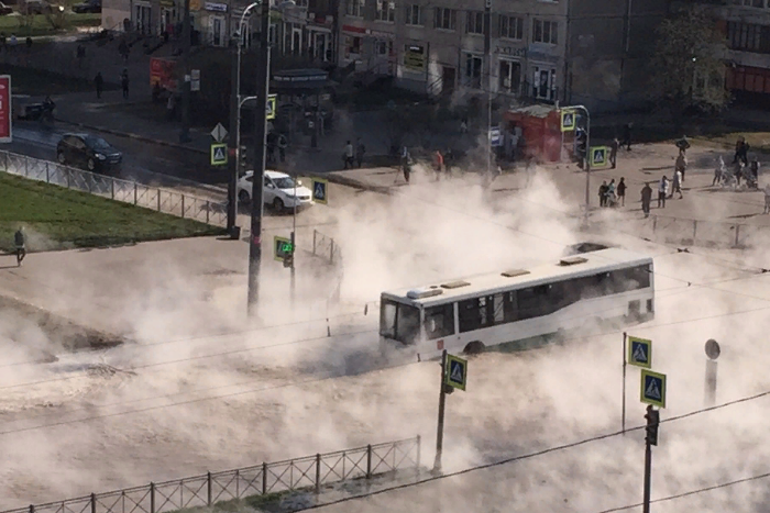 По словам очевидцев, людей из автобуса выводят через люк в крыше автобуса. Улицу при этом залило кипятком и заволокло паром.