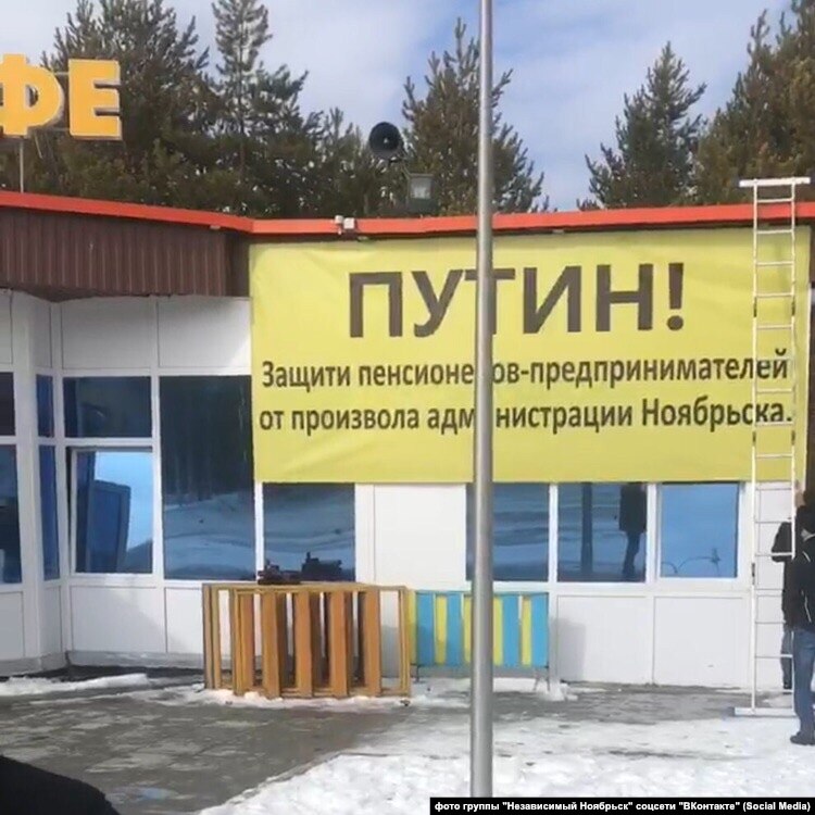 "Путин! Защити пенсионеров-предпринимателей от произвола администрации Ноябрьска", - написано на баннере, который предприниматель Геннадии Гунько разместил на своем кафе в детском парке. Сделал он это в день приезда в город губернатора Дмитрия Артюхова, сообщило издание Znak.com.