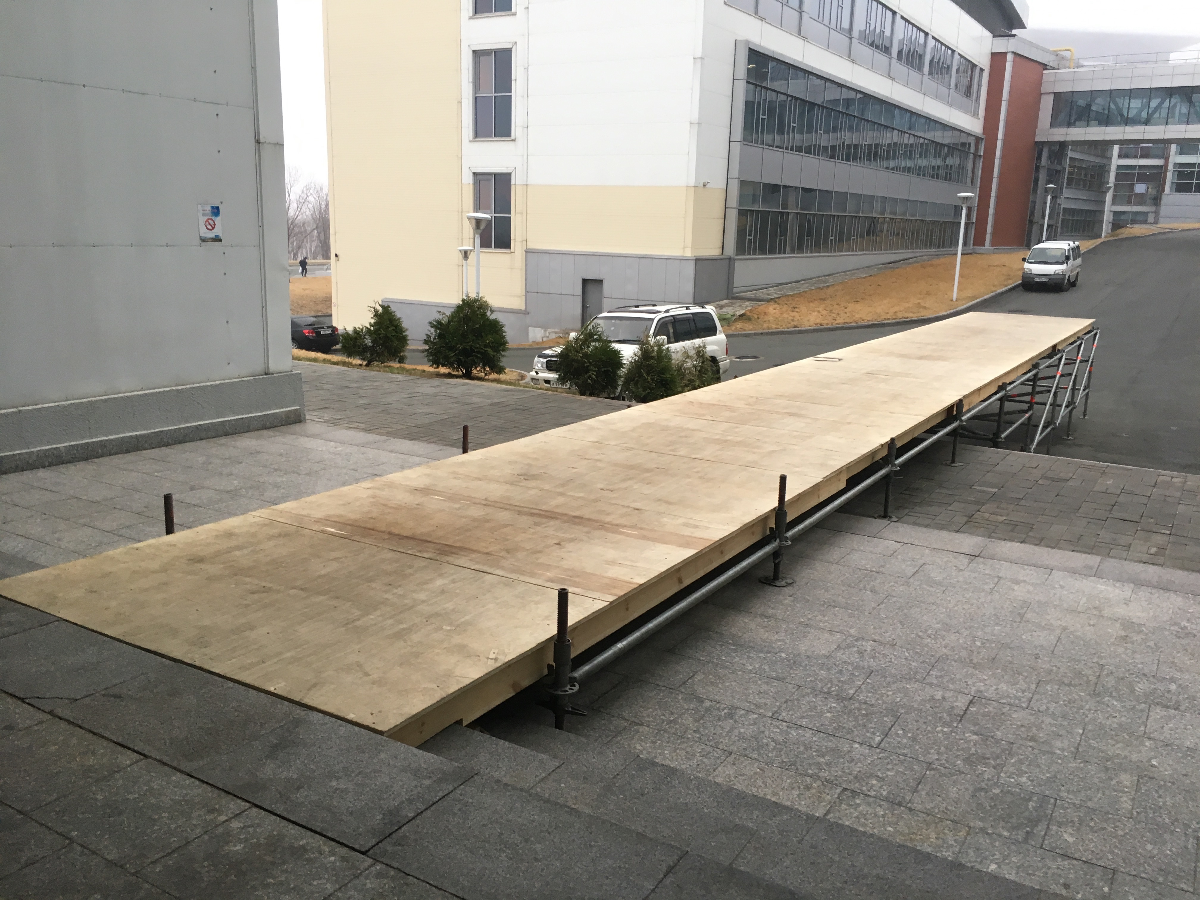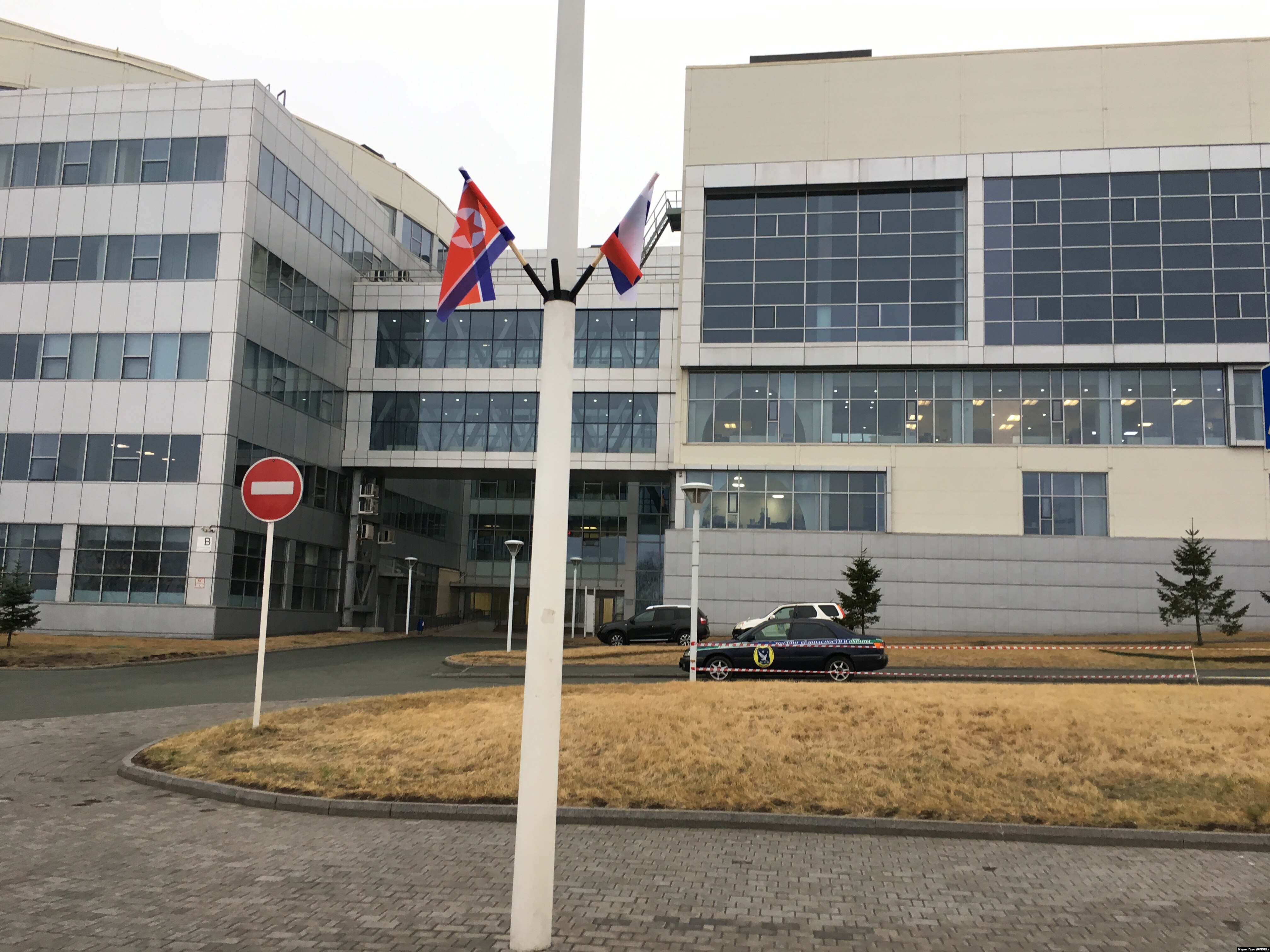 У второго входа в корпус S установлен деревянный подиум. Возможно, именно по нему в здание войдут Владимир Путин и Ким Чен Ын. Проходящие мимо рабочие не смогли или не захотели объяснить, зачем у входа появилось это деревянное сооружение. До приезда лидера КНДР оставались целые сутки, а рядом в тёмной тонированной машине без опознавательных знаков уже дежурил сотрудник ДПС в жёлтой жилетке. От интервью он, конечно, отказался.