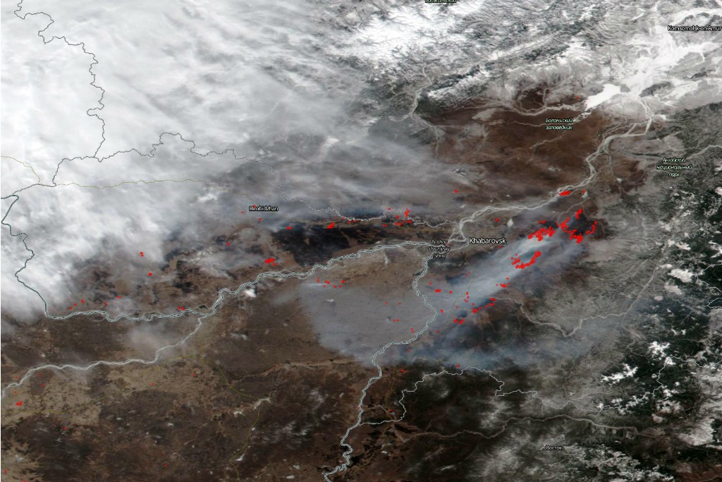 Спутники Sentinel европейской космической программы Copernicus зафиксировали масштабы природных пожаров в Сибири и на Дальнем Востоке в апреле 2019 года. Горят целые районы — в некоторых местах выжженные территории распространились на 30 км, а ветер относит дым пожаров на расстояние более 100 км от эпицентра.