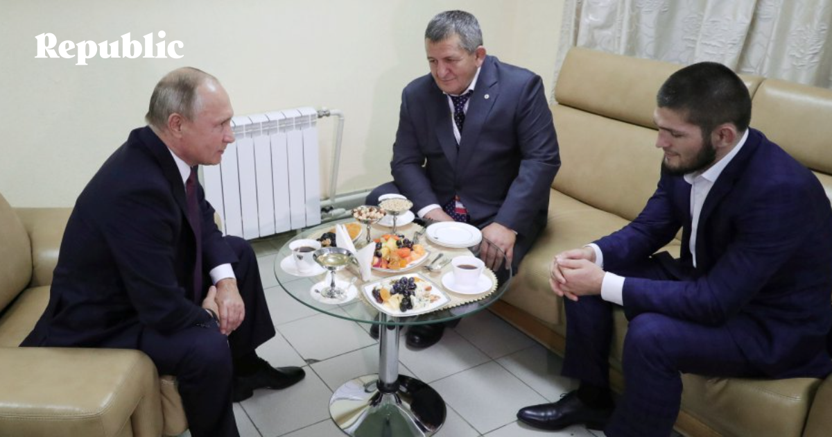 Владимир Путин, Хабиб Нурмагомедов и его отец Абдулманап Нурмагомедов. Фото: Mikhail Klimentyev / Kremlin / Reuters