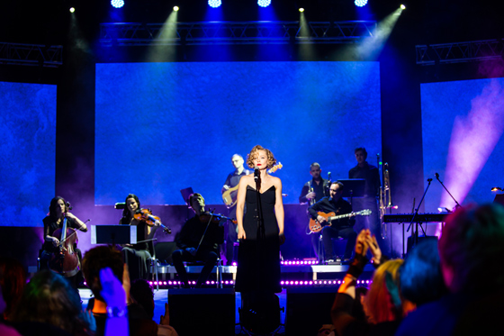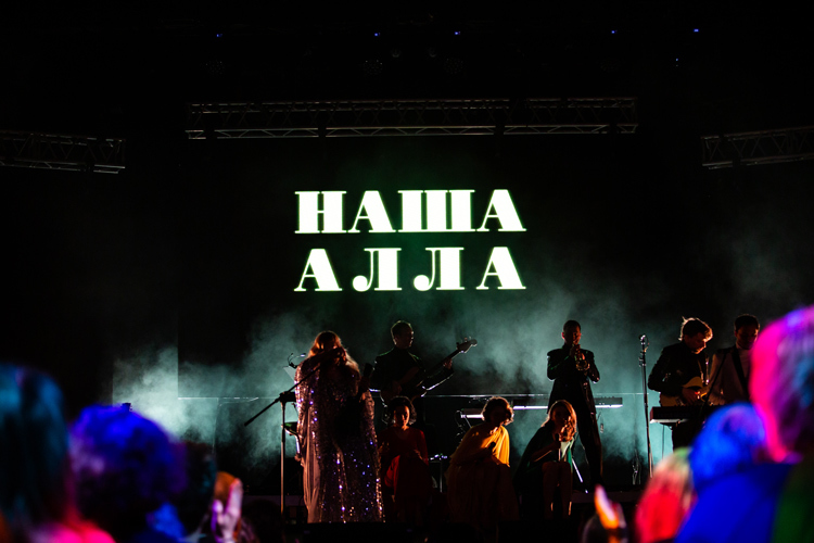 Все исполненные со сцены песни оказывались на перекрестке двух временных потоков, собранных в конструкцию двух планов. Первый план — собственно выступающие артисты, которые предъявляют музыкальную культуру новейшего времени во всем ее искрометном многообразии. Держащий линию горизонта второй план — хронотоп памяти, видеоэкраны, проецирующие портреты Аллы Пугачевой и кадры кинохроники, — биография страны. Возникает объем личного присутствия каждого зрителя в сложном ассоциативном коконе.