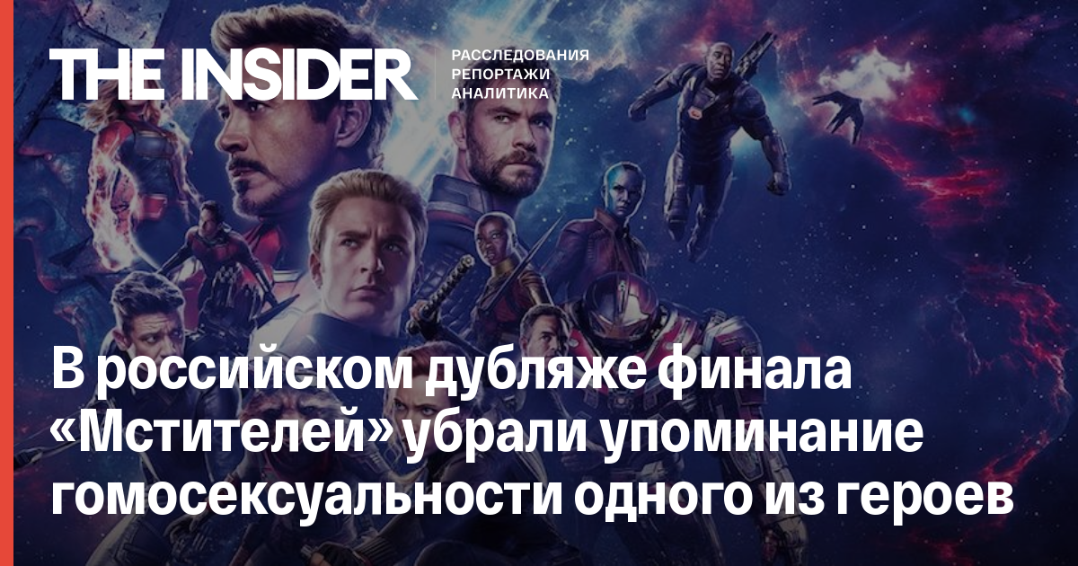 Из российского дубляжа фильма «Мстители: Финал» исчезла фраза одного из персонажей о том, что он идёт на свидание с мужчиной. Об этом сообщает TJ, который заметил несоответствие оригиналу.