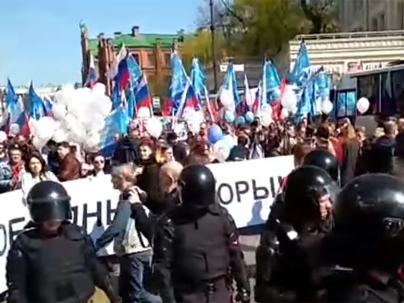 В Санкт-Петербурге, где как и в других городах России проходит согласованное с властями первомайской шествие, полиция и сотрудники Росгвардии разогнали колонну объединенных демократов и партии "Яблоко", вышедших на улицы под лозунгом "Свободному Петербургу - свободные выборы!".