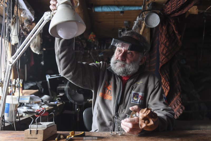 «Скотина-то не кормлена!» — говорил Захаров, выходя на крыльцо своего дома, чтобы покормить птиц. Он доставал из кармана семечки и шуруповерт, которым прикручивал кусочек сала на сделанную из коряг стойку кормушки. Настоящий Папа Карло: улыбка в глазах, круглые очки в тонкой оправе, кудрявые волосы. И кудрявая же борода, очень удобная для кукольника: когда кукла «говорит», рта говорящего за нее Захарова не видно.