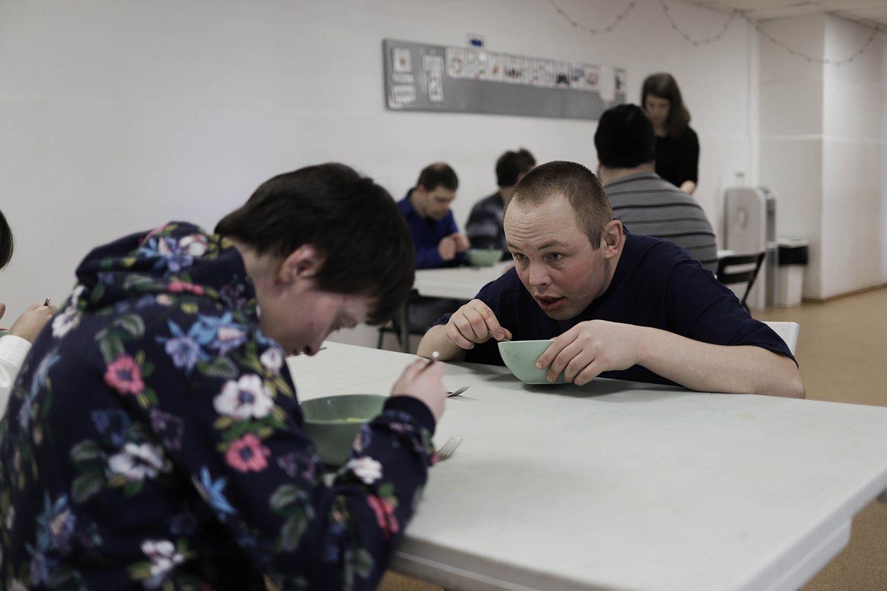 Evenings at the apartment are carefully planned, just like days at the center. First on Anton’s schedule is taking a bath — one of his favorite activities. “It’s his way of relieving stress. The water calms him,” explains one of his tutors, Natalia Elesina. Then it’s time for tea and making dinner: Anton boils pelmeni or pasta, dices some salad, and paces the apartment while the food cooks.