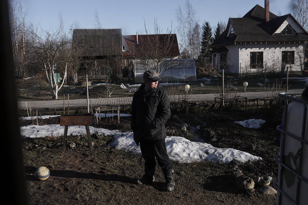 We meet Anton and his father, Vladimir Kharitonov, in the town of Koltushi, seven kilometers (about 4.4 miles) outside St. Petersburg. Anton is wearing sweatpants, a black jacket with bright blue buttons (the same color thread is sticking out through the top two holes), and a gray wool cap. At the “Seventh Kilometer,” as Anton calls it, is a cabin that belongs to Nina, Vladimir’s wife. For the past seven years, this is where Anton has spent his weekends, and in the summer he and his father travel 200 kilometers (125 miles) to the town of Malaya Vishera, to Anton’s home.