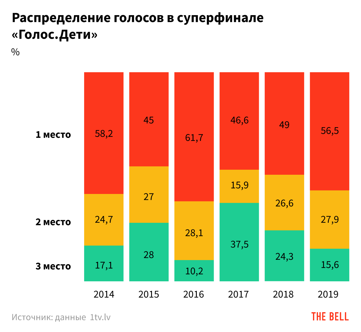 Всего, если верить протоколам, в голосовании в финале приняли участие около 330 тысяч человек. Для сравнения: в 2014 году, когда «Голос. Дети» в России проходил в первый раз, в финале голосовали около 800 тысяч человек, говорил продюсер проекта Юрий Аксюта. Но с тех пор его аудитория сильно упала. Финал 2014 года смотрели 6 млн человек, а голосовали, выходит, 13%. Финал 2019 года — 3,2 млн человек, голосовали 10%.