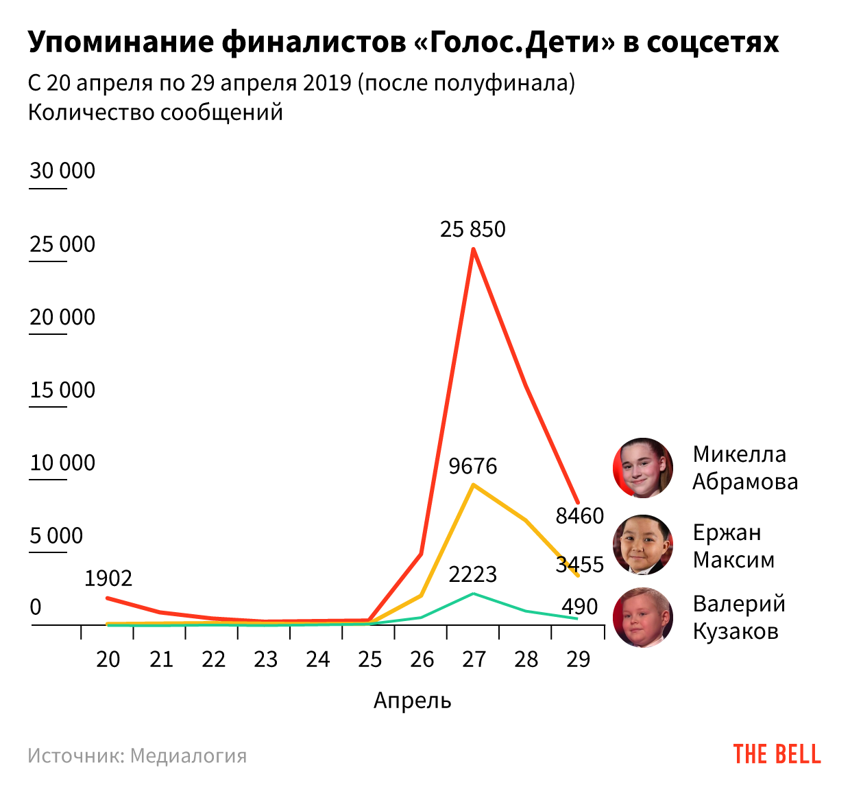 Агитация в соцсетях — одна из самых распространенных версий по поводу исхода голосования в детском «Голосе». По просьбе The Bell сервис «Медиалогия» подсчитал, что упоминаний Микеллы в соцсетях действительно было больше, чем Ержана Максима и Валерия Кузакова — ее противников в суперфинале, но резко разрыв увеличился уже в день голосования: 26 апреля Микеллу упоминали в соцсетях почти пять тысяч раз, Ержана — в два раза реже, Валерия — в девять раз. Для сравнения: накануне финала у Микеллы было всего 370 упоминаний в соцсетях, у Ержана — 142. А пик интереса пришелся на воскресенье, 27 апреля, когда пользователи весь день спорили в соцсетях по поводу чистоты победы в детском «Голосе».