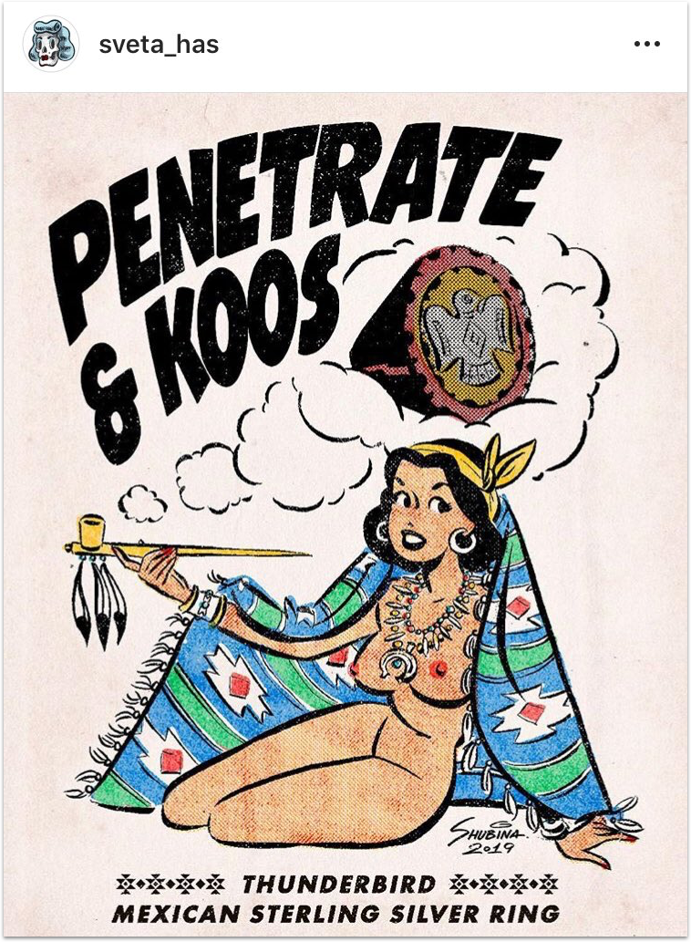 Через два дня после видео Шубина выложила в своем инстаграме пост с рекламой южнокорейских ювелирных компаний. Иллюстрация была посвящена кольцу с Громовой Птицей, но помимо самого украшения там была нарисована обнаженная девушка в традиционном индейском одеяле с церемониальной курительной трубкой.