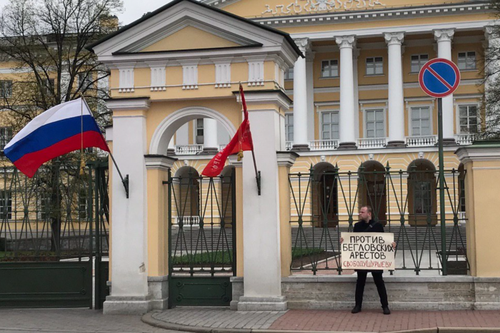 Перед Смольным стоит активист с плакатом «Против бегловских арестов». Как сообщает штаб Навального в Петербурге, одиночные пикеты продлятся до вечера.