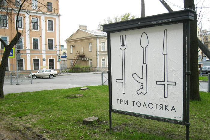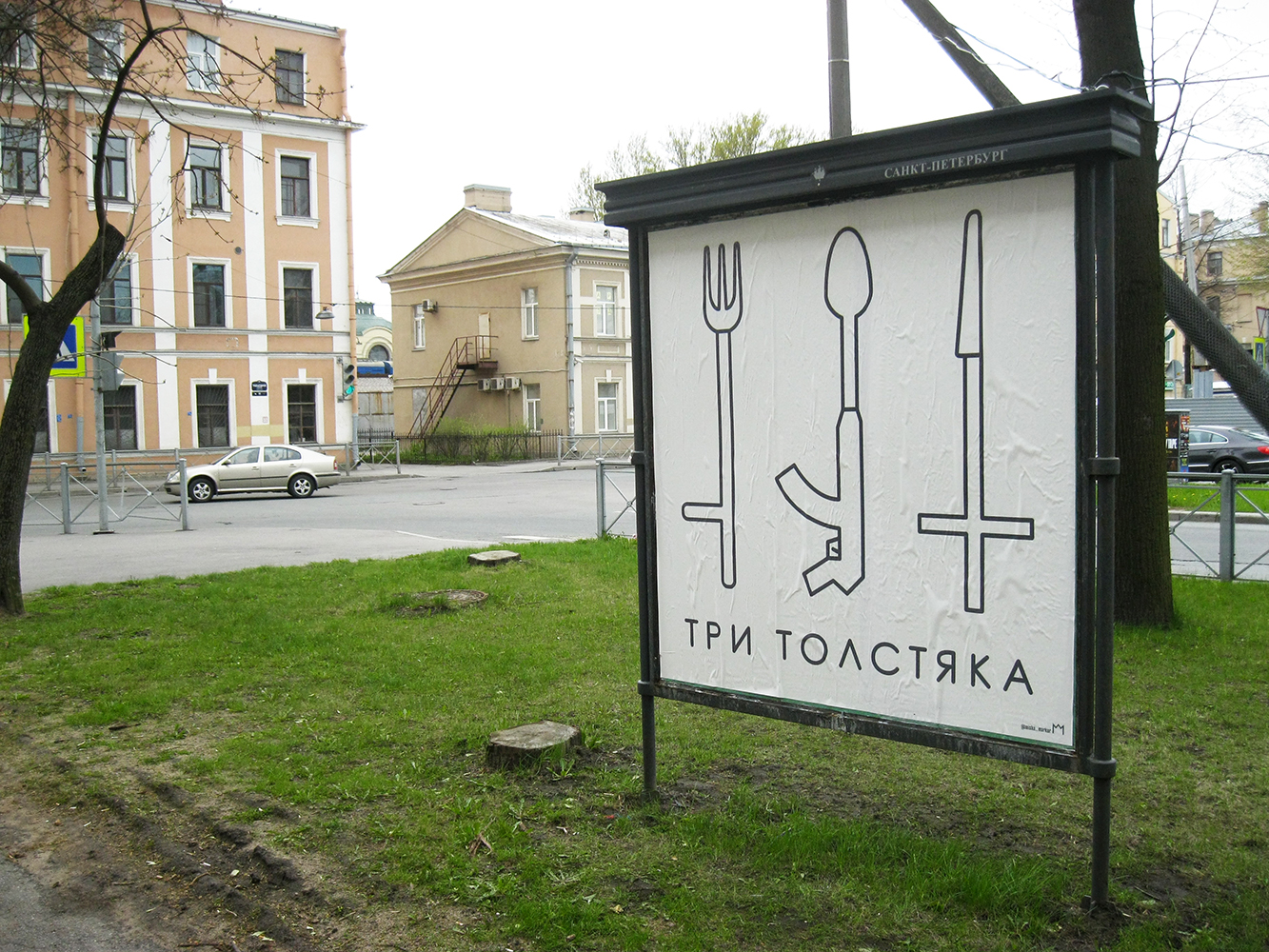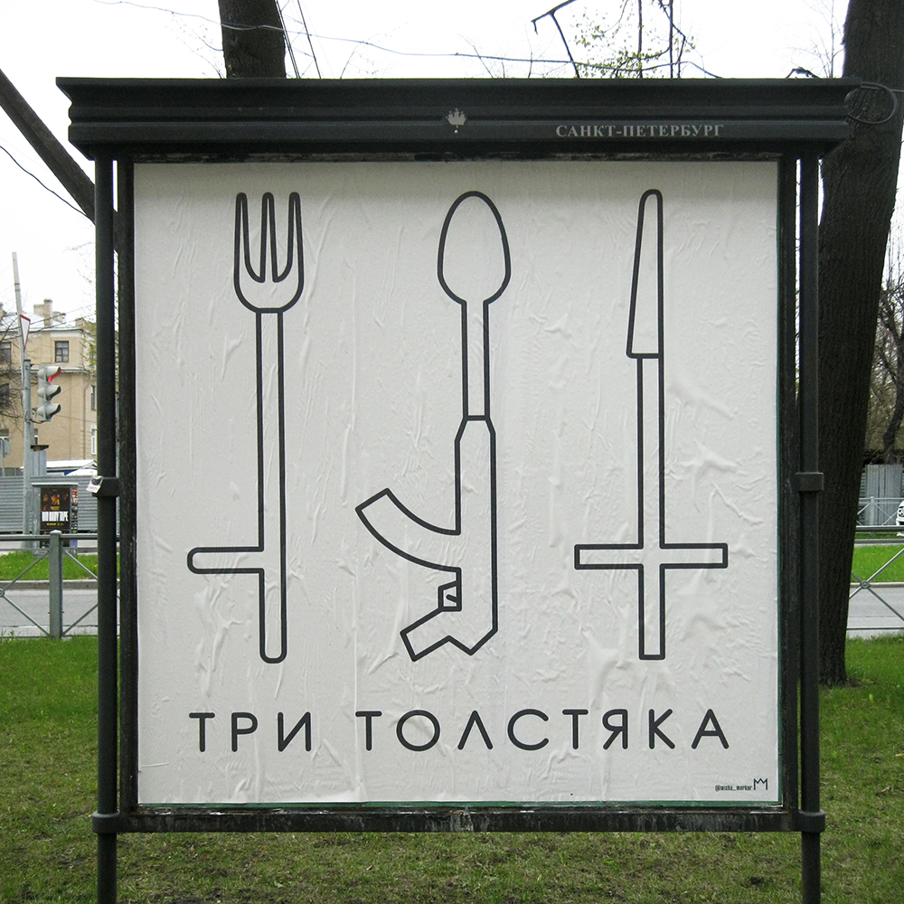 Уличный художник Миша Маркер разместил в Петербурге изображение под названием «Трапеза». На нем написано «Три толстяка» и нарисованы столовые приборы, которые по форме напоминают полицейскую дубинку, автомат и крест.