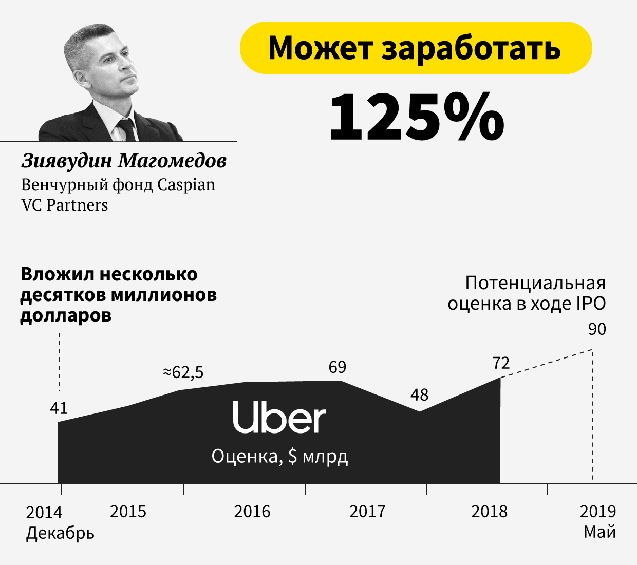 Зиявудин Магомедов инвестировал в Uber одним из первых в нашем списке и в целом с надеждой смотрел на американские технологические компании. Например, с 2015 года он вкладывался и в итоге стал крупнейшим инвестором стартапа Virgin Hyperloop One, который собирается строить систему сверхскоростных пневмопоездов по концепции Илона Маска. В 2016 году Hyperloop One, «Сумма» Магомедова и правительство Москвы даже подписали меморандум о строительстве ветки вакуумного поезда в Москве. Но год назад Магомедов оказался в тюрьме по подозрению в создании преступного сообщества, разбирательства еще идут.