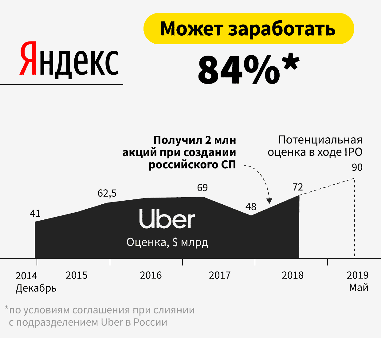 С «Яндексом» все просто — он стал владельцем 2 млн акций Uber при объединении активов Uber в России с «Яндекс.Такси». Пакет был получен исходя из оценки в $52 млн, а продать его «Яндекс» мог начиная с февраля 2019 года за $96 млн.