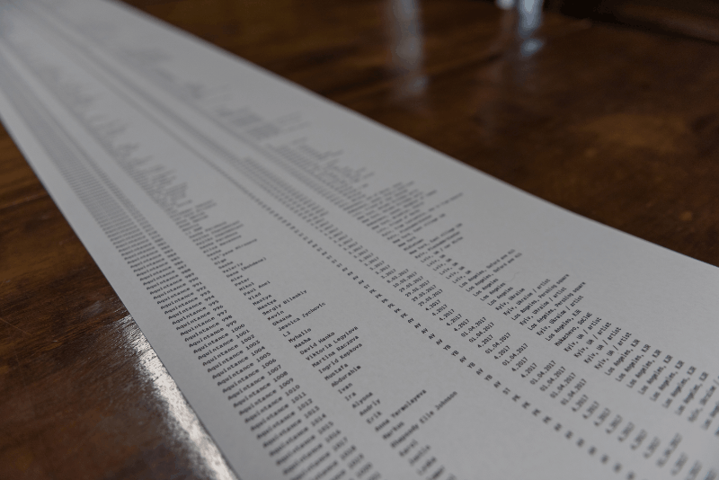 Варга: Мы начали проект «Без названия» в 2015 году. Договорились записывать данные обо всех наших знакомствах с людьми. После я поехал в Нью-Йорк и Лос-Анджелес, где провел год с небольшим. Можно ли сказать, что каждого, кого я встречал в клубах и на вечеринках в Нью-Йорке и Лос-Анджелесе, я мысленно приравнивал к погибшим в АТО? Наверное, нет. Эти числа оставались абстрактными. Хотя статистика не стояла на месте, и к старым знакомствам добавлялись новые; потом, когда они через принтер отпечатывались на бумаге, все они казались отчужденными. Вероятно, в этой холодности и даже бездушности кроется притягательная сила этой работы.