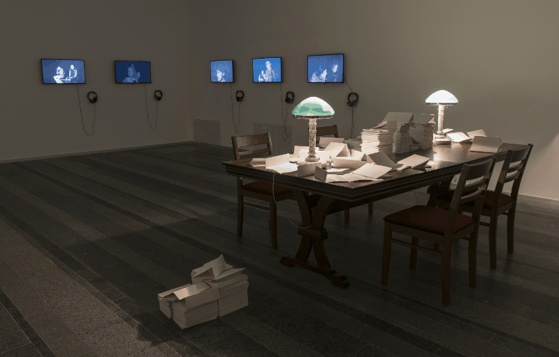 «Открытая группа» (Антон Варга, Юрий Билей, Павел Ковач). Исключительно для внутреннего использования. 2015. Мультимедийная инсталляция: акция, фотография, тираж книг, шесть видео