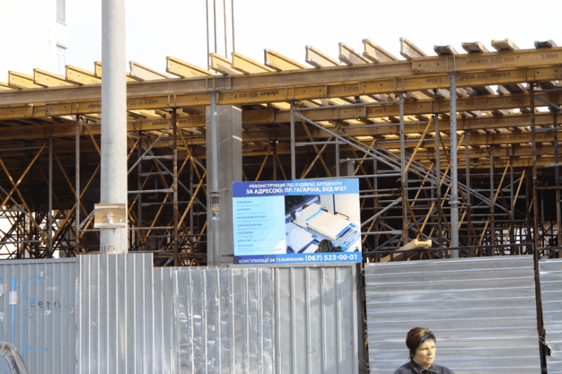 В проекте «Паспорт объекта» (2014) мы совершаем интервенции в строящиеся здания и на паспорте объекта — он всегда висит на заборе, ограждающем стройку, — анонсируем появление новой институции. Писали, к примеру, что в этом доме будет центр современного искусства или галерея. Мы планировали реализовать его в разных местах, но пока сделали только в городе Днепр (старое название — Днепропетровск), видоизменив паспорта пяти строящихся объектов.