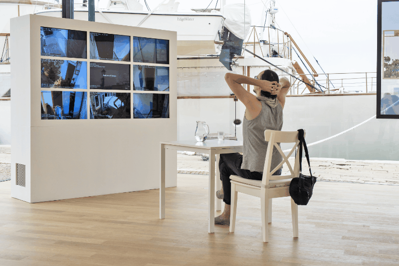 «Открытая группа» (Юрий Билей, Павел Ковач, Станислав Турина, Антон Варга). Без названия. 2015 — наст. вр. Стол, принтер, интернет-интерфейс, бумага. Проект сделан в рамках выставки Future Generation Art Prize @ Venice 2017 на LVII Венецианской биеннале