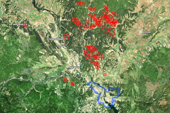 Сайт космического мониторинга пожаров. Синий контур — Иркутск, красные контуры — границы возгораний