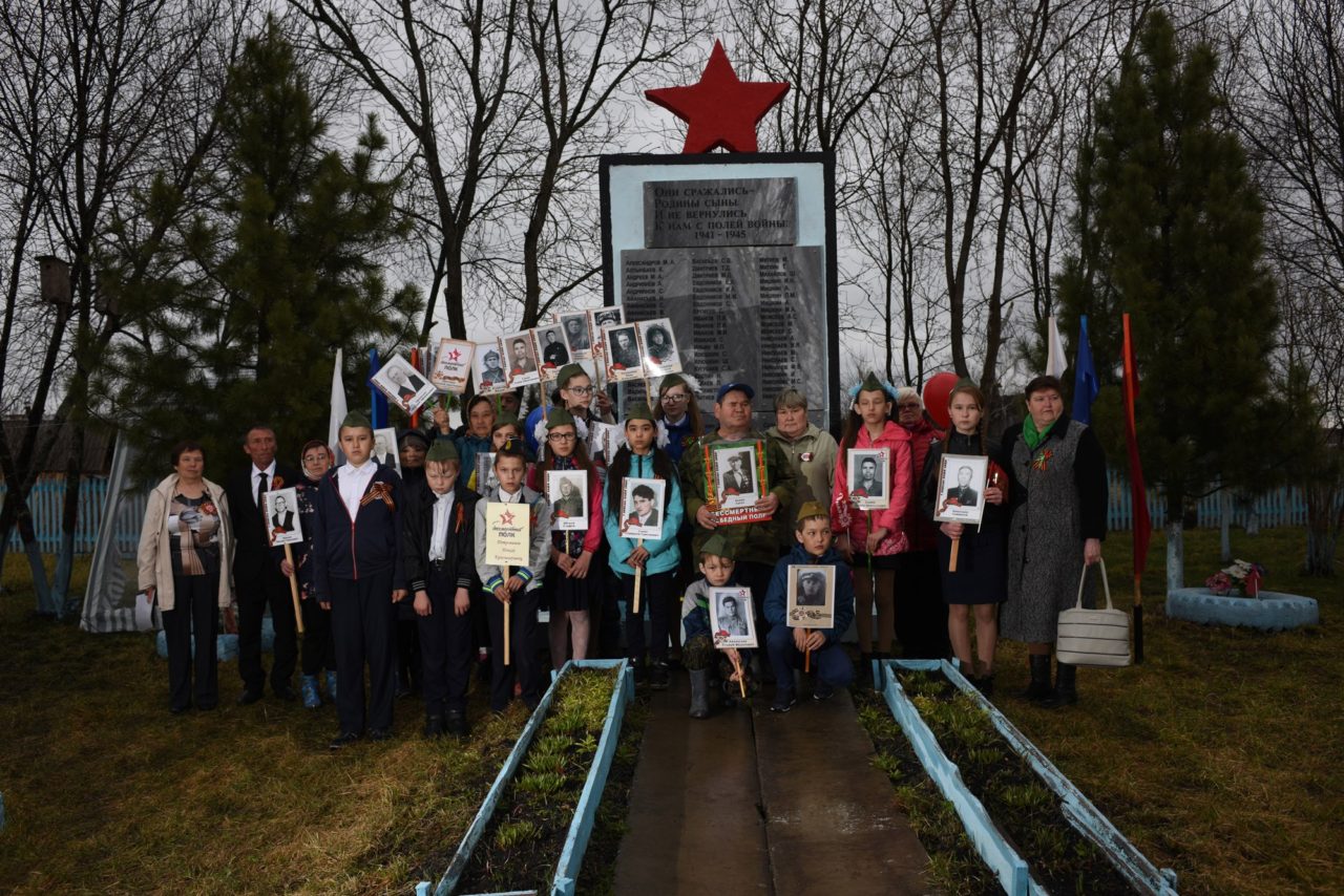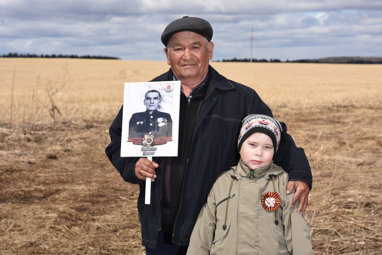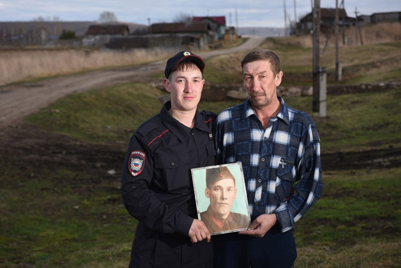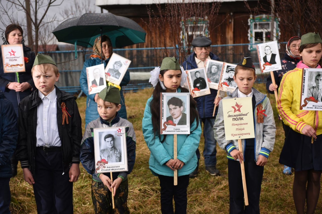 Жители деревни Андрейково с портретом ветерана. Свердловская область, 2018 г.Фото: Александр Сорин, Федор Телков/Проект "Урал мари. Смерти нет" Под песни военных лет дети промаршировали до памятника, прочитали там стихи, а директор и замдиректора клуба разыграли по ролям текст, скачанный из интернета. Но при этом митинг не выглядел мероприятием для отчета, хотя отчет и отправили в департамент культуры Ачитского района.