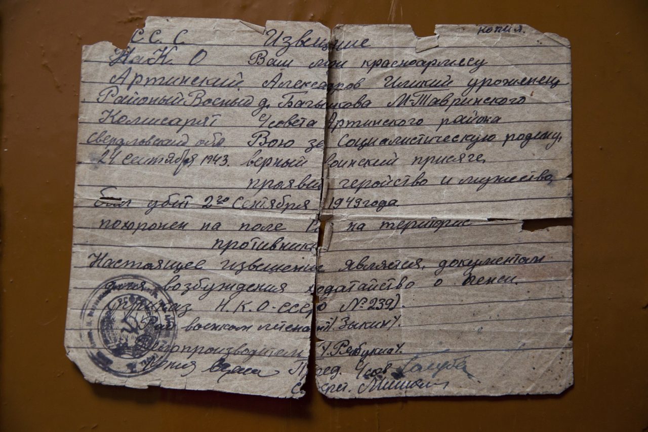«Похоронка», документ из семейного архива. Деревня Малая Тавра, Свердловская областьФото: Александр Сорин, Федор Телков/Проект "Урал мари. Смерти нет" В конце торжественной части на пьедестал памятника поставили стакан с водкой, положили кусок хлеба и зажгли свечу. Это стало логичным переходом от торжественной части к неформальной — гораздо более важной с точки зрения семейной памяти.